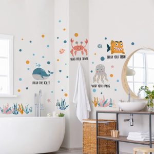 ARS® Bathroom Rule Sign Sea Animal Wall Decals Stickers, Wash Brush Flush Whale Octopus Crab Nursery Decorations Baby Boy Girl Washroom Art, Neutral Seaweed Polka Dot Toddler Kids Home Decor Gift