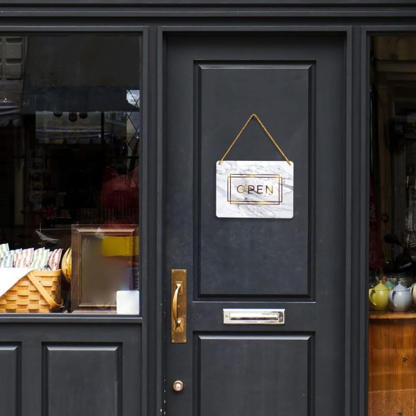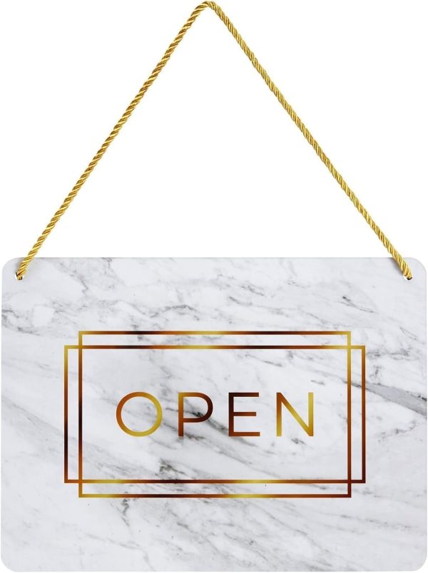 About this item Elegant white and black marble Design with Gold lining adds a touch of sophistication to your shop or Retail space Durable Material: The open and closed sign is made of solid wood, making this business sign reliable and waterproof. Durable material ensures it is not easy to deform or break, you can use it for a long time without worry. Reversible hanging sign makes it easy for customers to see whether you’re open or closed Special Design: The open and closed business sign use black as the background and natural wood color as text color. This design is simple yet elegant. The words on the signboard are neat and smooth, upgrade the decoration of your store. Wide Application:The open and closed sign can be applied to coffee shop, restaurant, hotel, pet shop and other occasions; it can be hung in front of the store to show people whether your store is close or open, open sign express your welcome to clients.