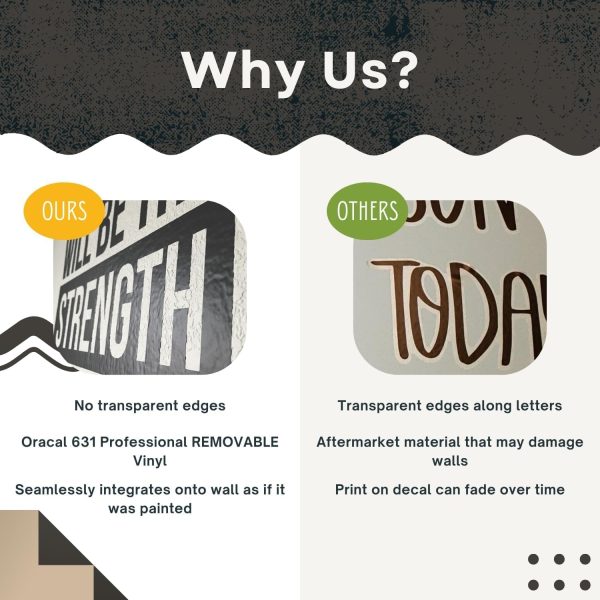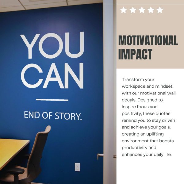 About this item SIZE: 17×22 inches EASIEST TO APPLY IN THE MARKET: Our inspirational quote wall decals are made in TWO PIECES and is PEEL OFF READY. It also comes PREMIUM ORACAL 631 VINYL: Our motivational wall decals are MANUFACTURED IN UAE. Oracal 631 Vinyl is well known for its long lasting adhesive abilities, beautiful matte finish, and high quality. This company is used in most big brand stores for their interior typography. SAFE & FUN: Putting a decal up together with your family & friends is a fun activity that will you sighing with appreciation. It is REMOVABLE & WON’T DAMAGE THE WALLS. The perfect inspirational wall art decor for home bedroom, living room, and office INSPIRE & CREATE A POSITIVE ATMOSPHERE: YOU CAN. End of Story.