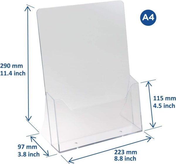 About this item PRACTICAL, CONVENIENT & FUNCTIONAL: This brochure holder has rounded and smooth edges for safety. It is compact and sits well on any surface. The slanted design makes sure that the brochures are easily viewable and stays in the holder without falling off. Premium Clear Acrylic: Made from high-quality transparent acrylic for a clean, professional look and long-lasting durability. CRYSTAL CLEAR DESIGN: Give your literature the attention it deserves. This brochure display stand is made from acrylic sheets that are completely transparent and flawless. This means that your pamphlet gets the best visibility possible. DURABLE ACRYLIC CONSTRUCTION: The acrylic used is durable and can handle everyday heavy-duty use without breaking, losing form, or cracking. The robust acyclic construction of this magazine holder keeps this holder looking new for years to come. VERSATILE USES: Not just for organising and displaying your brochures, this leaflet dispenser can also be used to organise your desk. Slip in your bills, memos, papers mails and keep your office or study desk free of clutter. PERFECT SIZE: This file magazine holder can hold any brochure, leaflet, or promotional material the most popular and standard size. Despite its holding capacity, desk magazine holder takes up minimum space on your desk and looks very elegant as well.