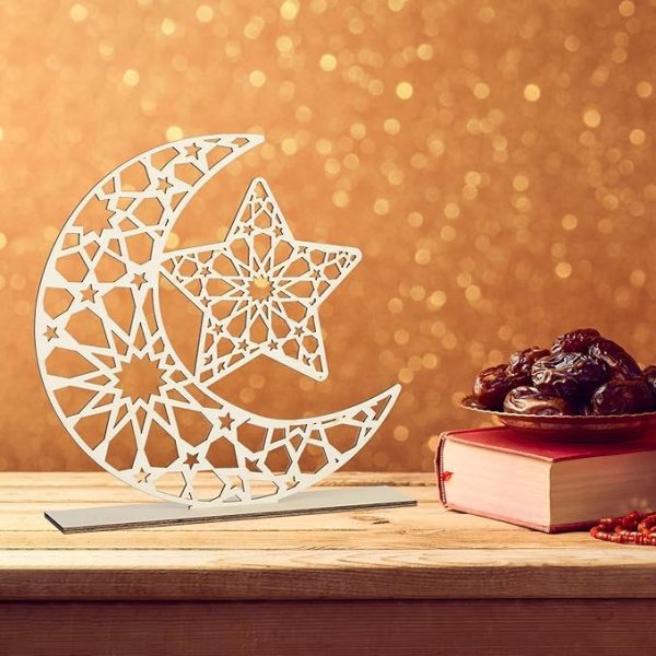 ARS® Pack of 2 Wooden Eid Mubarak Ramadan Kareem Decorations Eid Table Sign Moon Hollow Star Freestanding Table Centrepiece Hanging Ornaments Table Decoration for Muslim Islam Table Decoration