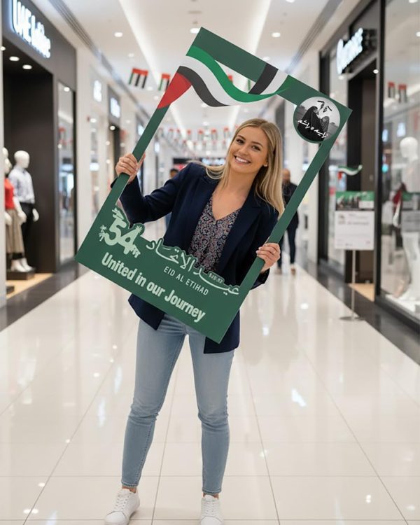 About this item PREMIUM DESIGN: Large selfie frame measuring 120 cm x 80 cm, crafted from 5 mm rigid foam board with full-colour UV digital printing for stunning visual impact. VERSATILE SIZE: Spacious frame dimensions accommodate 2-3 people comfortably, perfect for both standing and seated photo opportunities. CUSTOMISATION OPTIONS: Features dedicated space for logos, hashtags, and bilingual text in Arabic and English, ideal for corporate and institutional branding. PROFESSIONAL FINISH: Available in matt or glossy finish with internal die-cut window for optimal photo composition and clarity. IDEAL FOR EVENTS: Perfect for schools, offices, malls, and National Day celebrations with UAE flag colours and 54th anniversary commemorative design.